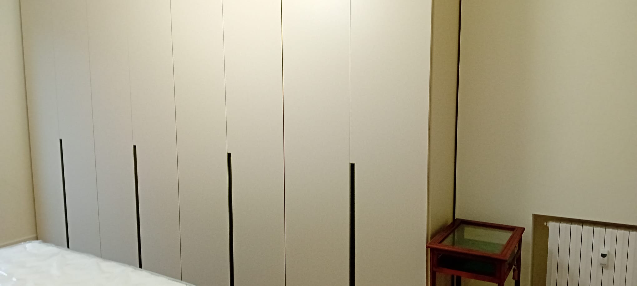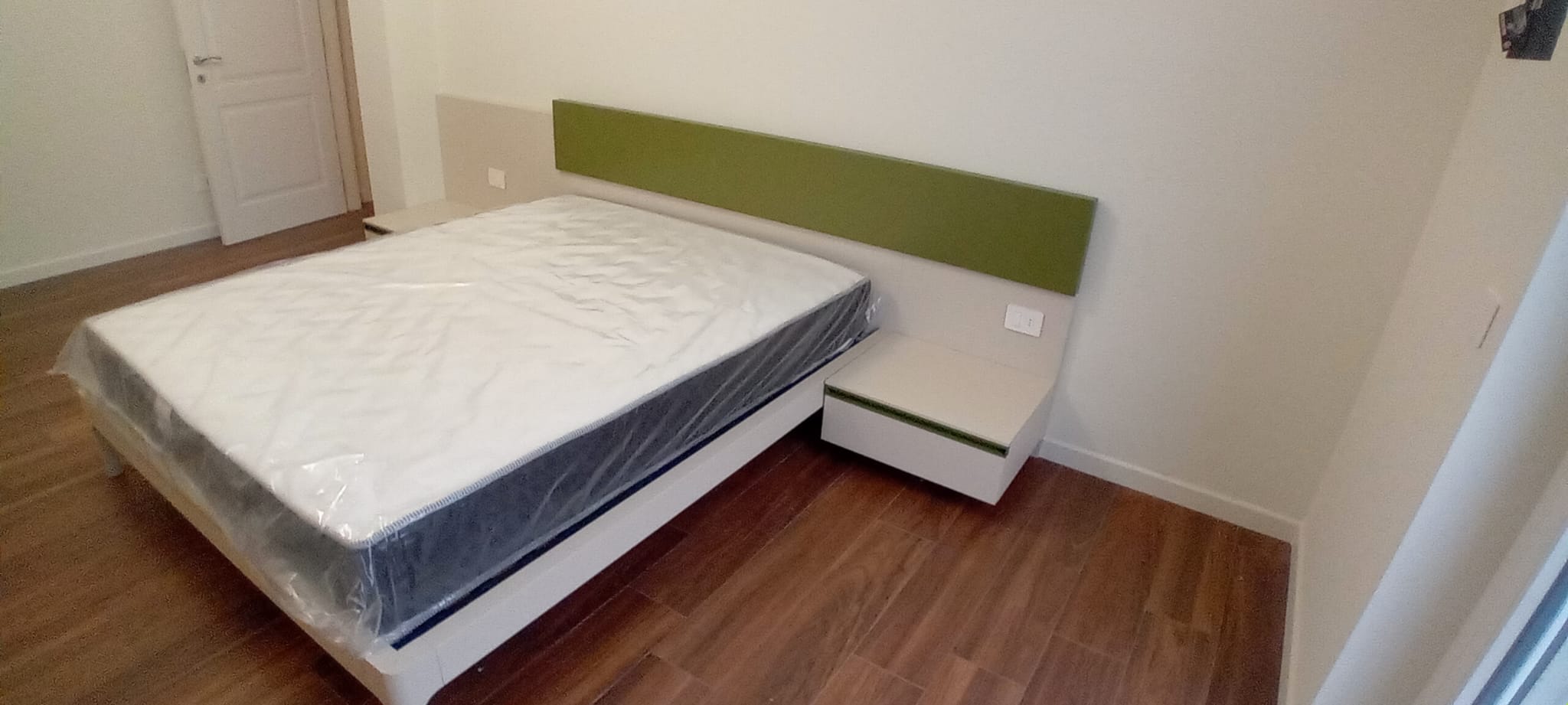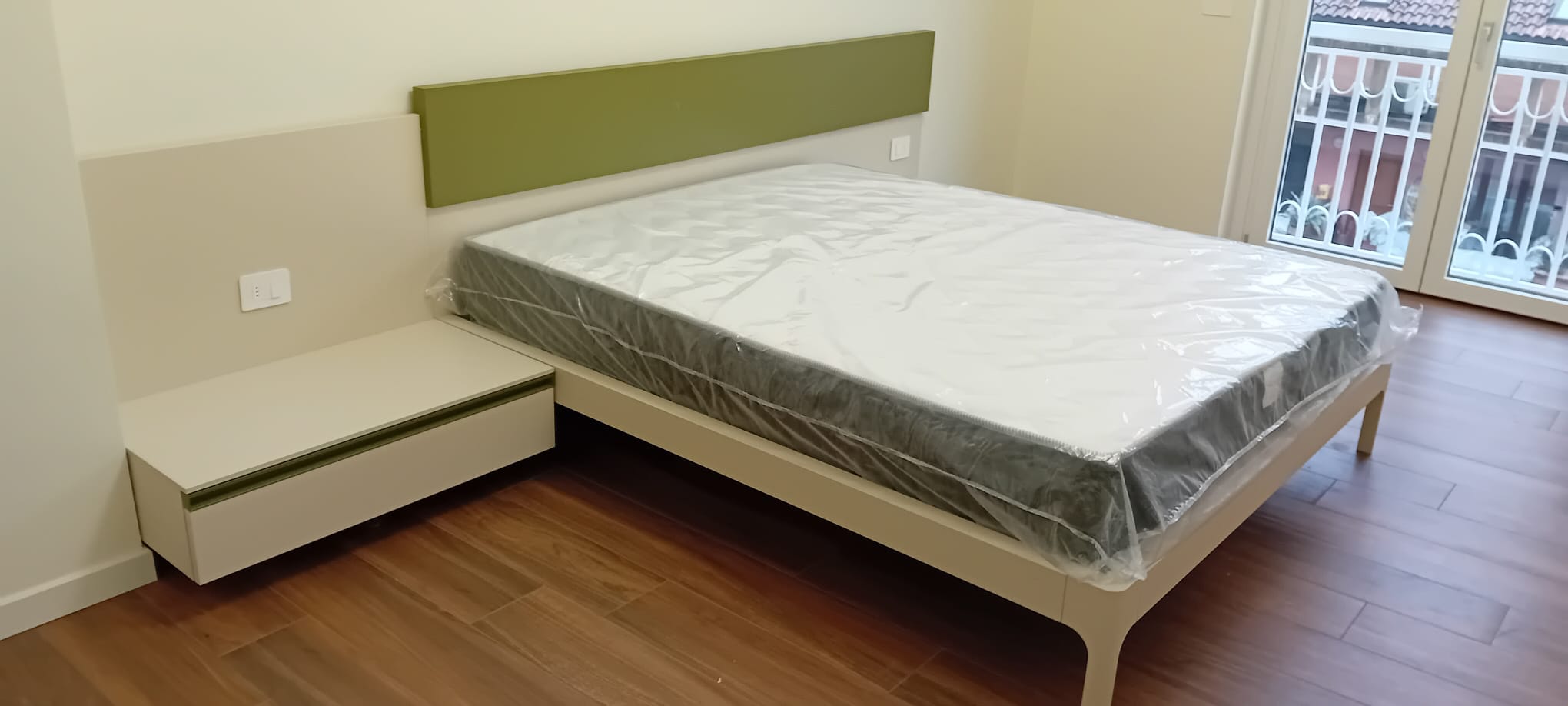 Lo stesso filo conduttore ci accompagna nella camera da letto, dove il design si fa dinamico grazie alla testata del letto modello “Domino”, caratterizzata da un’alternanza di spessori e colori. L’attenzione al dettaglio è totale: le maniglie dell’armadio a battente richiamano puntualmente la tonalità verde della testata, creando un total look rilassante e coordinato in tutta la casa.