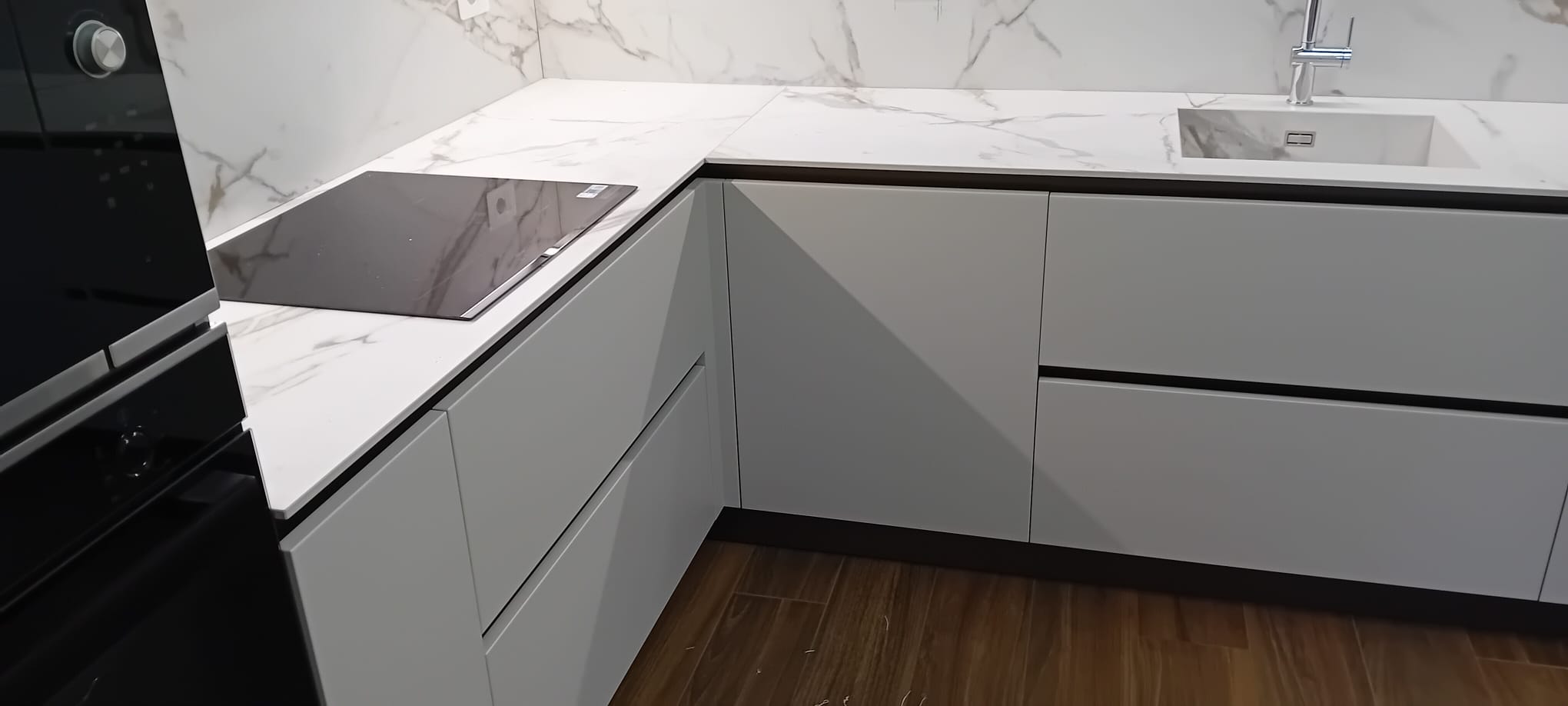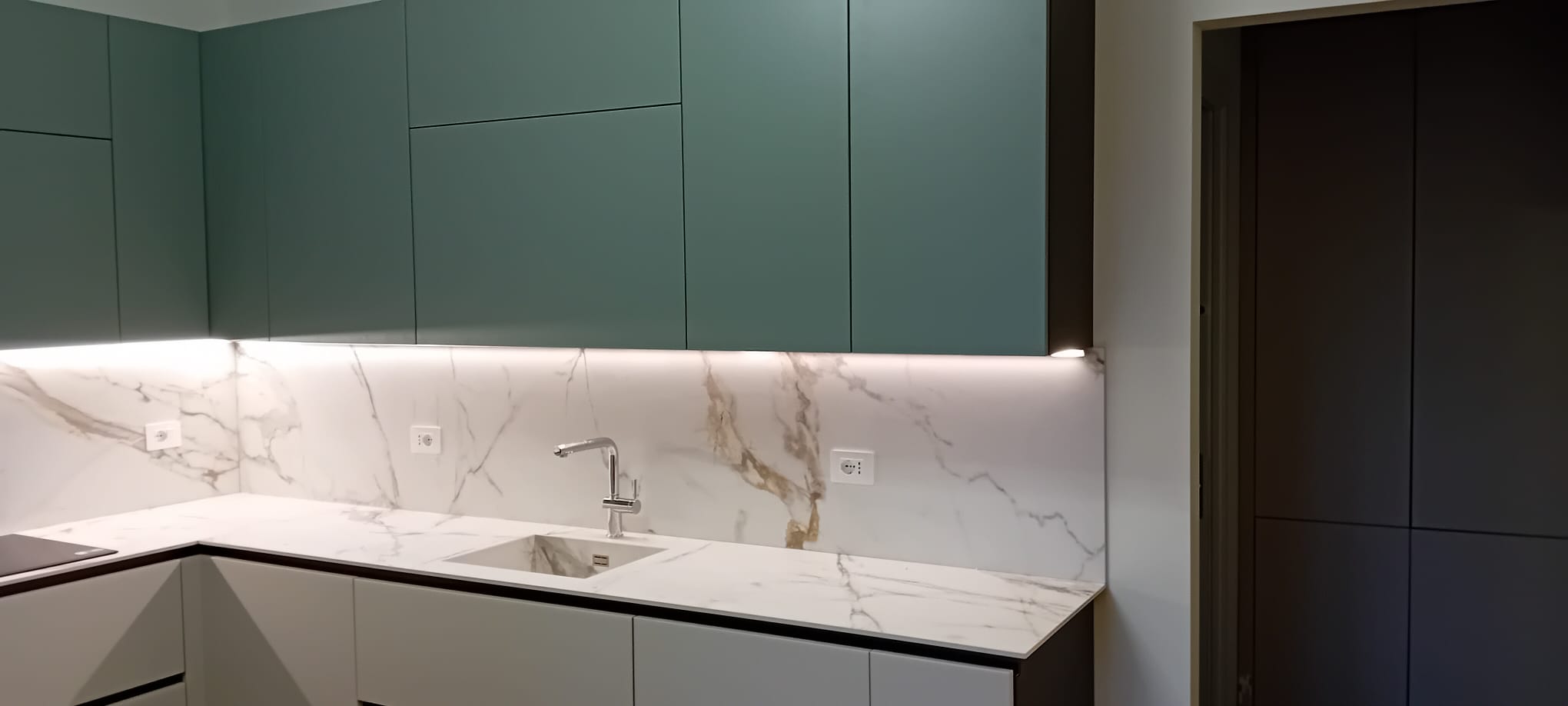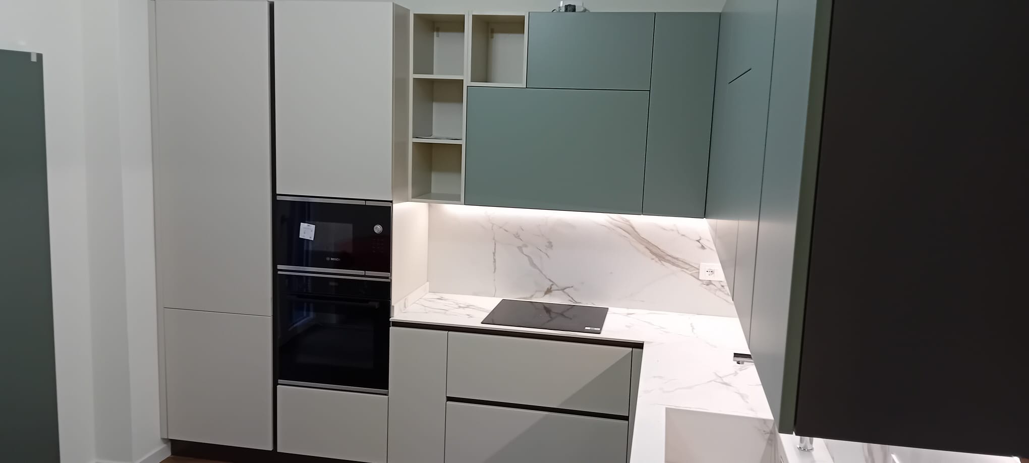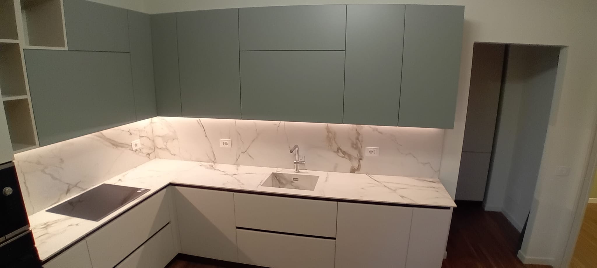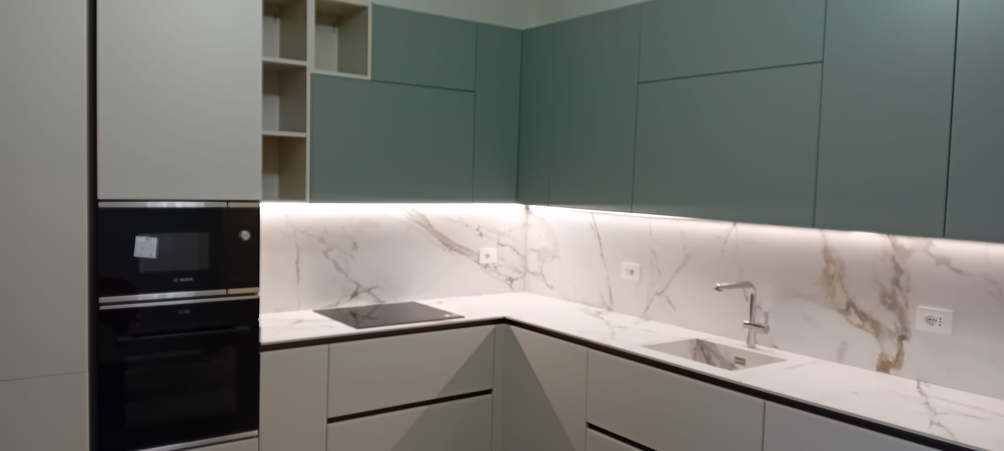 In questo intervento milanese abbiamo curato sia la zona giorno che la zona notte creando un raffinato dialogo di colori. In cucina, la soluzione angolare gioca sul contrasto delicato tra i pensili verde matcha e le basi color ecru, elevati dall’eleganza dello schienale e del top in ceramica effetto marmo con vasca lavello integrata.